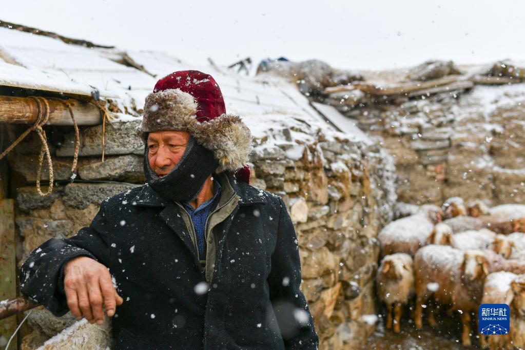 春羔生產高峰期突然降雪,哈布得拉什么在羊圈里檢查,看是否有小羊羔出生(4月12日攝)。