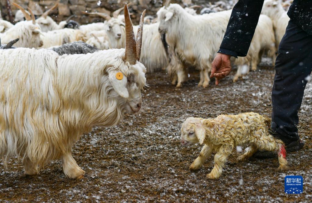 哈布得拉什么幫助一只當天上午出生的小羊羔回到母羊身邊吃奶(4月12日攝)。