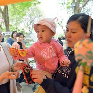 4月18日,市民在東營市清風湖黃河大集上參觀非遺展。