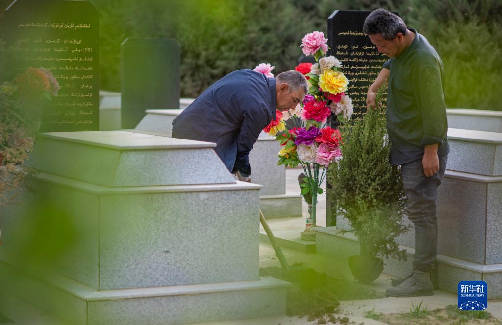 4月16日,艾尼瓦爾·艾買爾(左)在葉城烈士陵園種植柏樹苗。