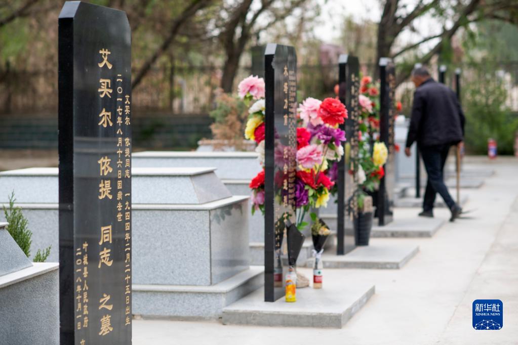 4月16日,在葉城烈士陵園,艾尼瓦爾·艾買爾查看柏樹苗的長勢。他的父親艾買爾·依提去世后被安葬在陵園內。