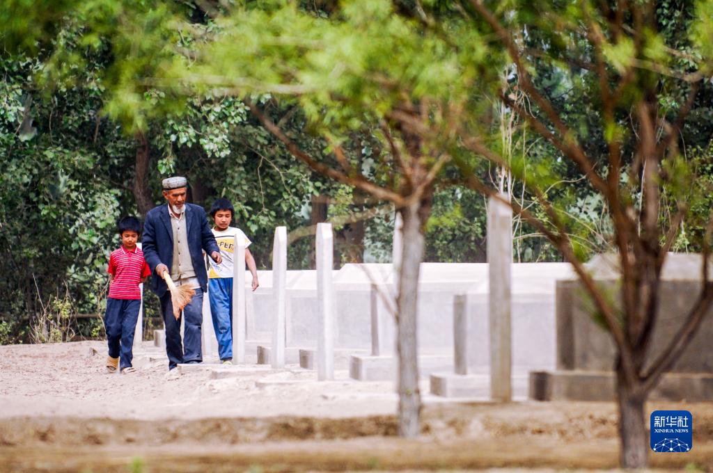 艾買爾·依提生前帶著兩個孫子在陵園掃墓(2011年4月30日攝)。