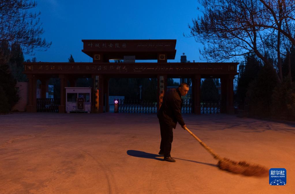 4月16日,天還不亮,艾尼瓦爾·艾買爾來到陵園大門口打掃衛生。