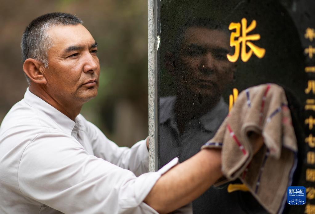 4月16日,艾尼瓦爾·艾買爾在葉城烈士陵園擦拭墓碑。