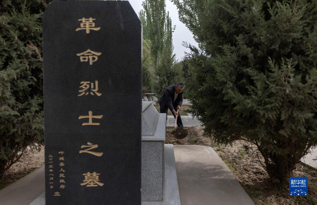 4月16日,艾尼瓦爾·艾買爾在葉城烈士陵園鋤草。