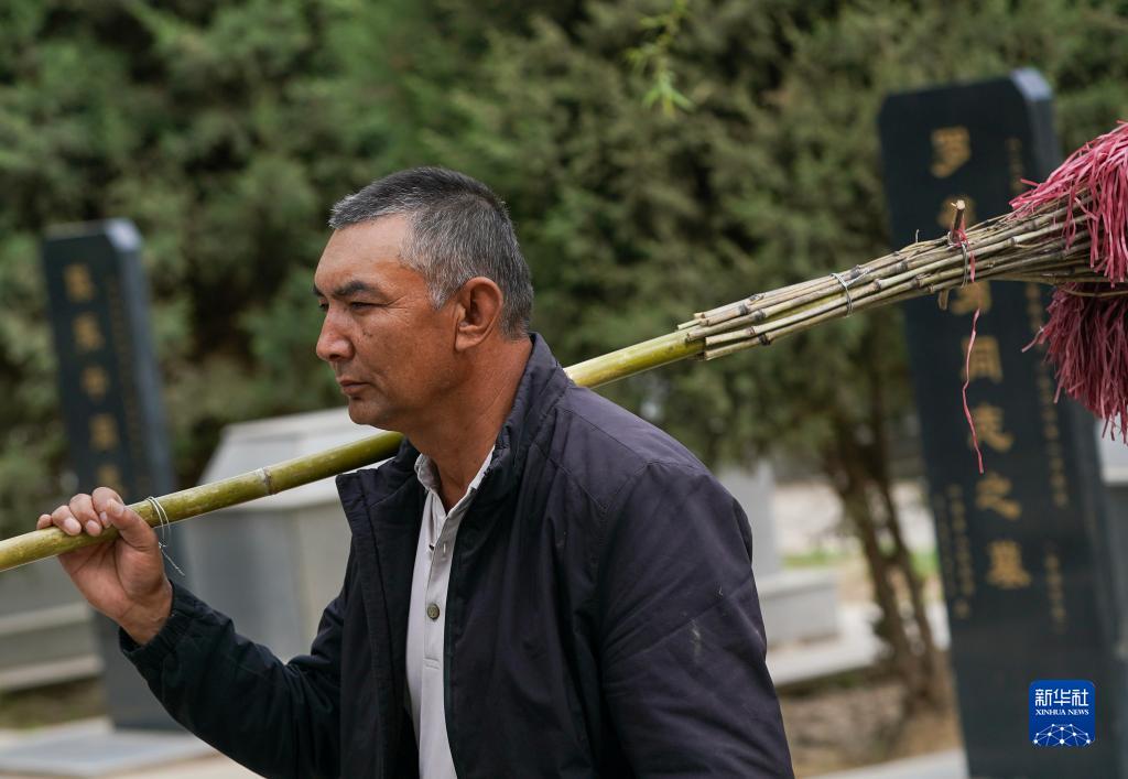 4月16日,在新疆葉城烈士陵園,艾尼瓦爾·艾買爾肩扛掃把準備去打掃陵園。