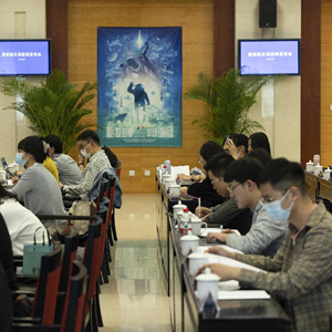 4月18日拍攝的2023年中國航天日新聞發布會現場。