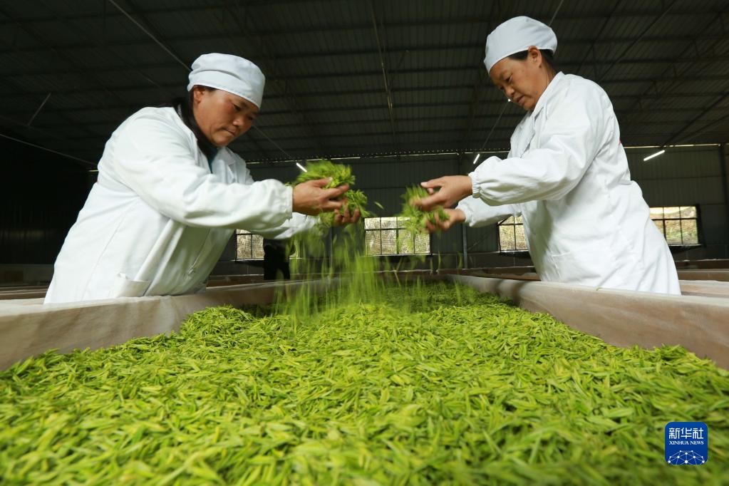 在貴州省平塘縣通州鎮黨振村一家茶葉加工廠,工人在攤晾茶青(3月27日攝)。