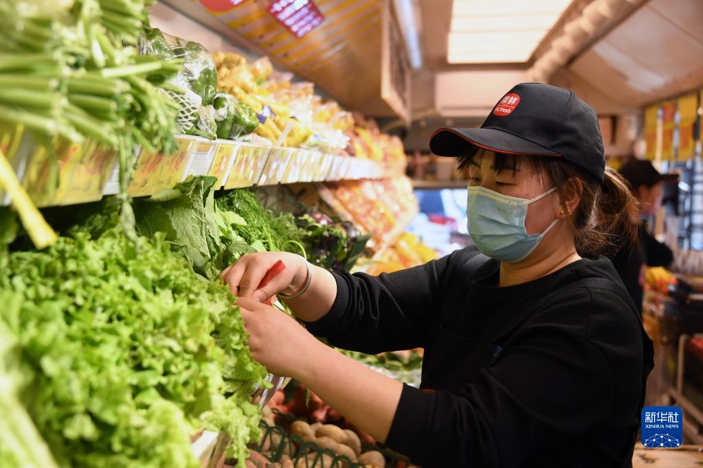 4月18日,在位于北京市朝陽區柳芳公交場站東北角的“公交便民驛?!?,工作人員在碼放蔬菜。