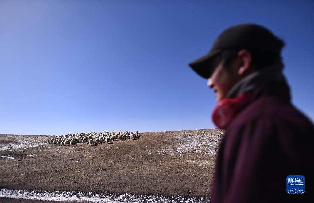 4月14日,在青海省海北藏族自治州剛察縣泉吉鄉寧夏村,牧民拉寶將羊群趕往草場。