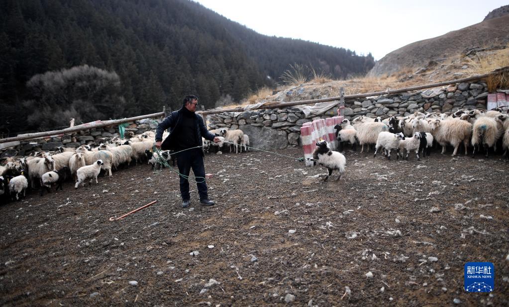 4月9日,在青海省海北藏族自治州祁連縣扎麻什鄉郭米村,牧民桑太才郎在羊圈中查看羊羔身體狀況。