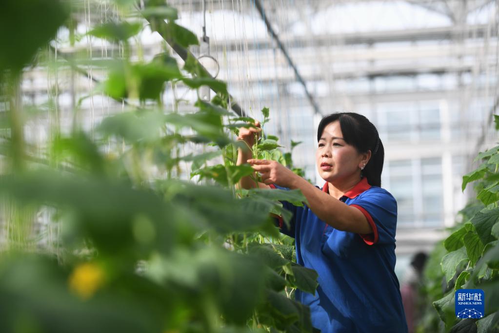 4月18日,河北省邢臺市南和區賈宋鎮一家現代農業園區工人在對黃瓜進行日常管理。