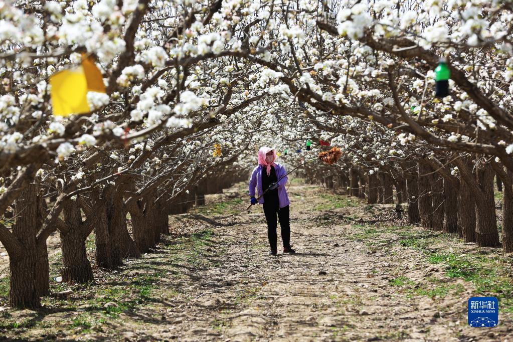 4月18日,果農在甘肅省張掖農場早酥梨園進行人工授粉。