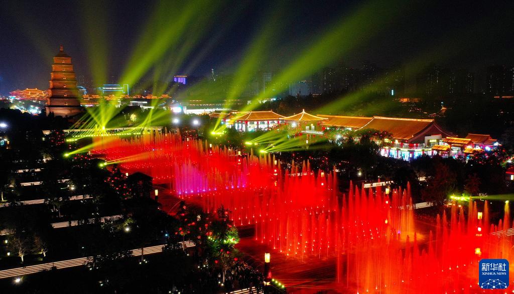 陜西西安大雁塔北廣場音樂噴泉是西安旅游打卡地之一,每天會進行四場演出,吸引市民和游客前來觀看。