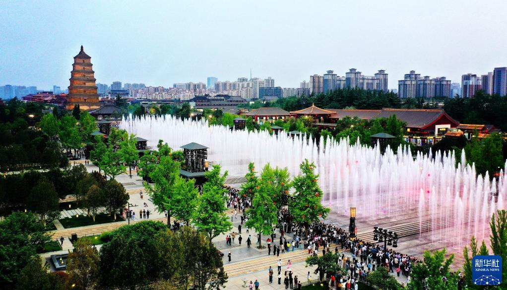 陜西西安大雁塔北廣場音樂噴泉是西安旅游打卡地之一,每天會進行四場演出,吸引市民和游客前來觀看。