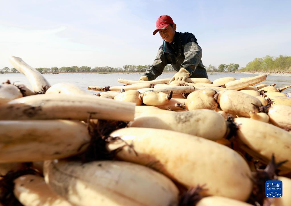 4月19日,唐山市豐南區東田莊鄉大吳莊村農民在水塘里采收蓮藕。