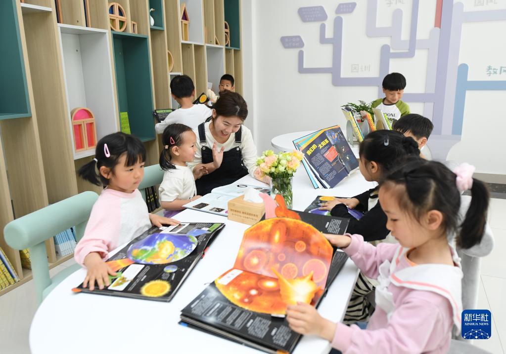 4月19日,吳興區八里店鎮中心幼兒園的老師帶著孩子們在書吧閱讀繪本。