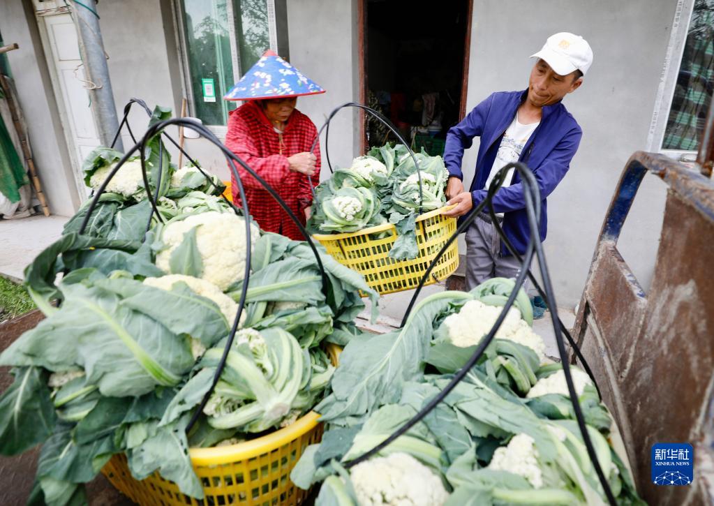 4月18日,在大湖鄉東姚村湖東果蔬農民專業合作社種植基地,村民將收獲的花菜裝車。