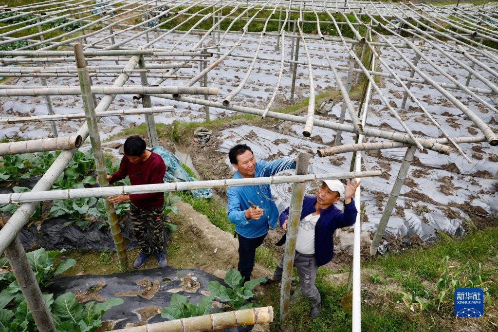 4月18日,在大湖鄉東姚村湖東果蔬農民專業合作社種植基地,村民在搭建種植棚。