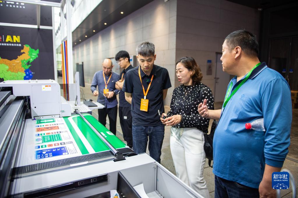 4月19日,在長沙國際會展中心,工作人員(右三)向觀眾介紹一款交通標識打印設備。