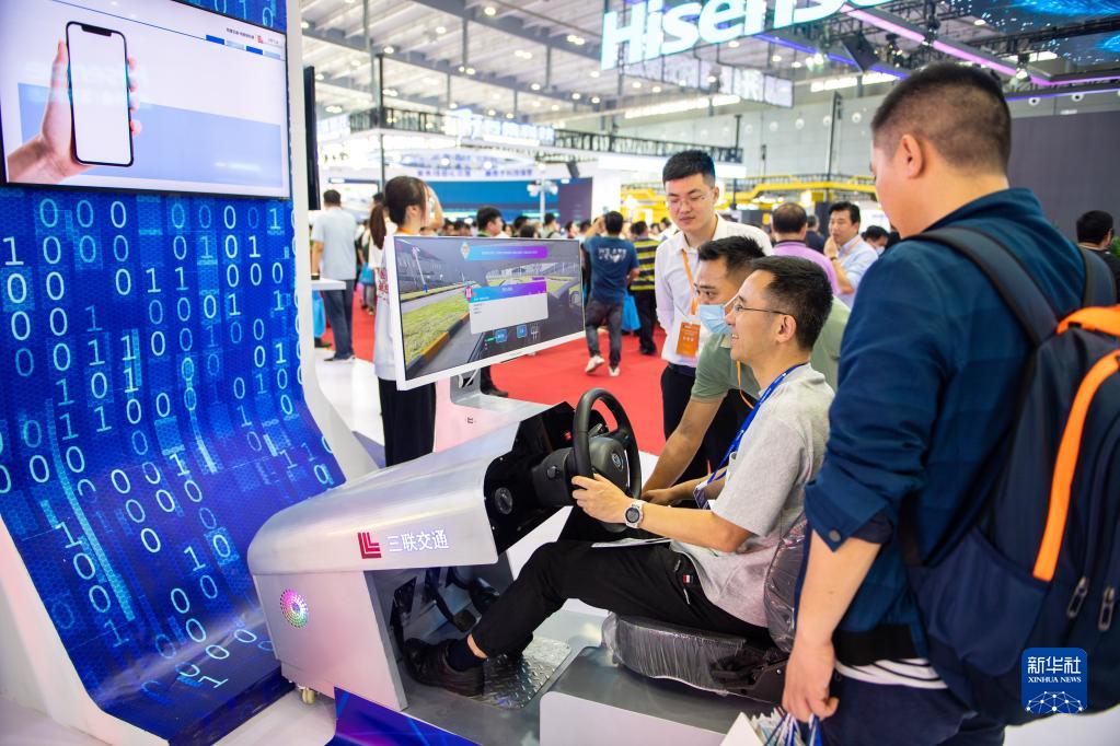 4月19日,在長沙國際會展中心,觀眾在體驗模擬駕駛系統。