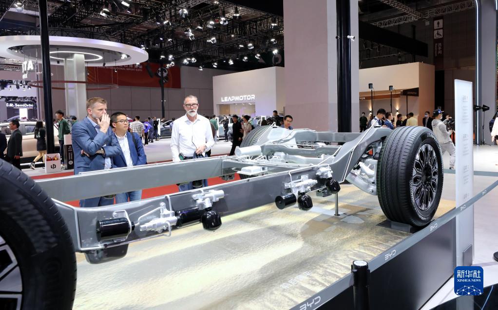 4月19日,參觀者在比亞迪汽車展臺展出的智能液壓車身控制系統展品前駐足觀看。