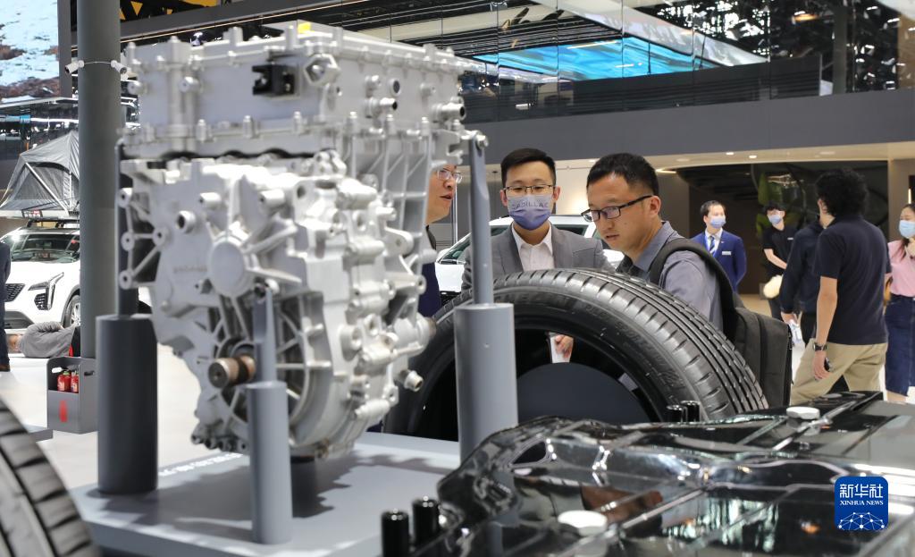 4月18日,參觀者在凱迪拉克汽車奧特能電動車平臺展示模型前交流討論。