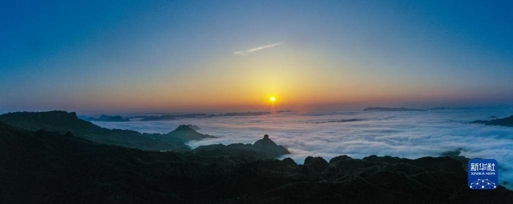 這是4月19日拍攝的金佛山日出時分的云海景觀(無人機拼接照片)。