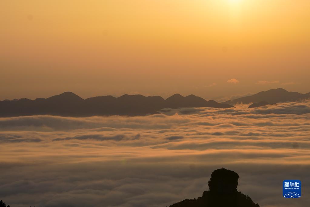 這是4月19日拍攝的金佛山日出時分的云海景觀。