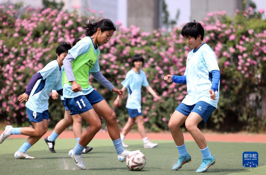 4月19日,在安徽省合肥市裕溪路學校,女足隊員進行足球訓練。