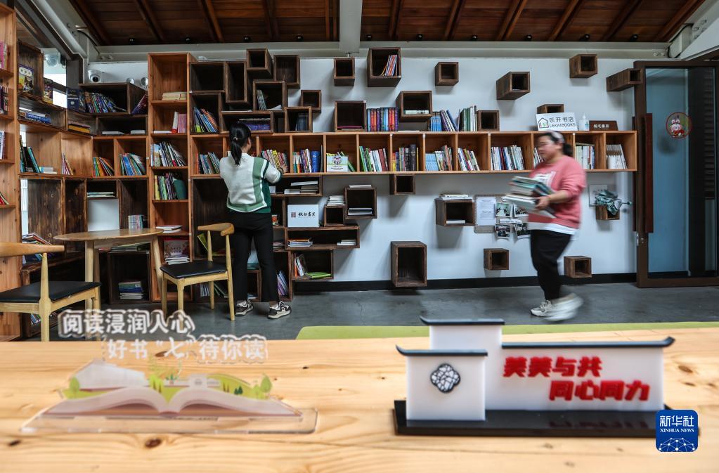 4月19日,工作人員在江村小書齋整理少兒讀物。