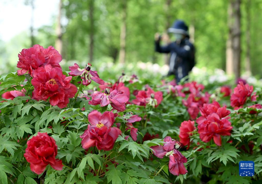 4月19日,游客在石家莊市植物園牡丹園內觀賞拍照。