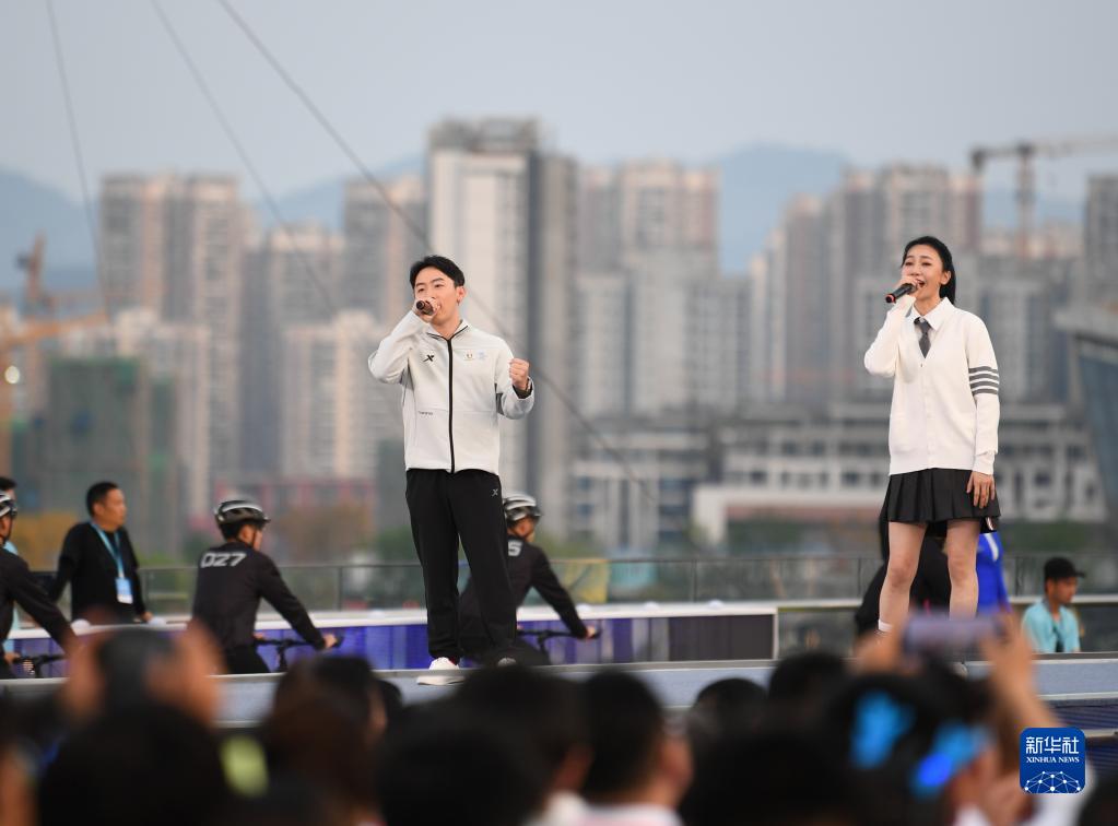 4月19日,在成都大運會倒計時100天啟動儀式上,體操世界冠軍鄒凱(左)演唱歌曲《歡迎來成都》。
