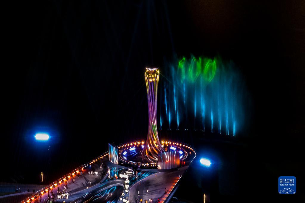 這是4月19日拍攝的第31屆世界大學生夏季運動會主火炬以及映在水幕上的“100”字樣(無人機照片)。