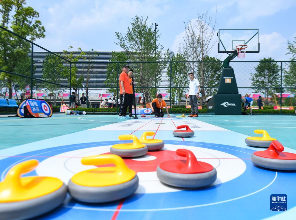 4月19日,在成都東安湖體育公園,體育愛好者在 “潮流運動會”上體驗陸地冰壺。