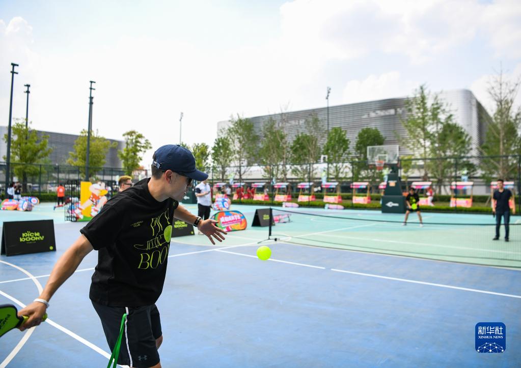 4月19日,在成都東安湖體育公園,體育愛好者在 “潮流運動會”上打匹克球。