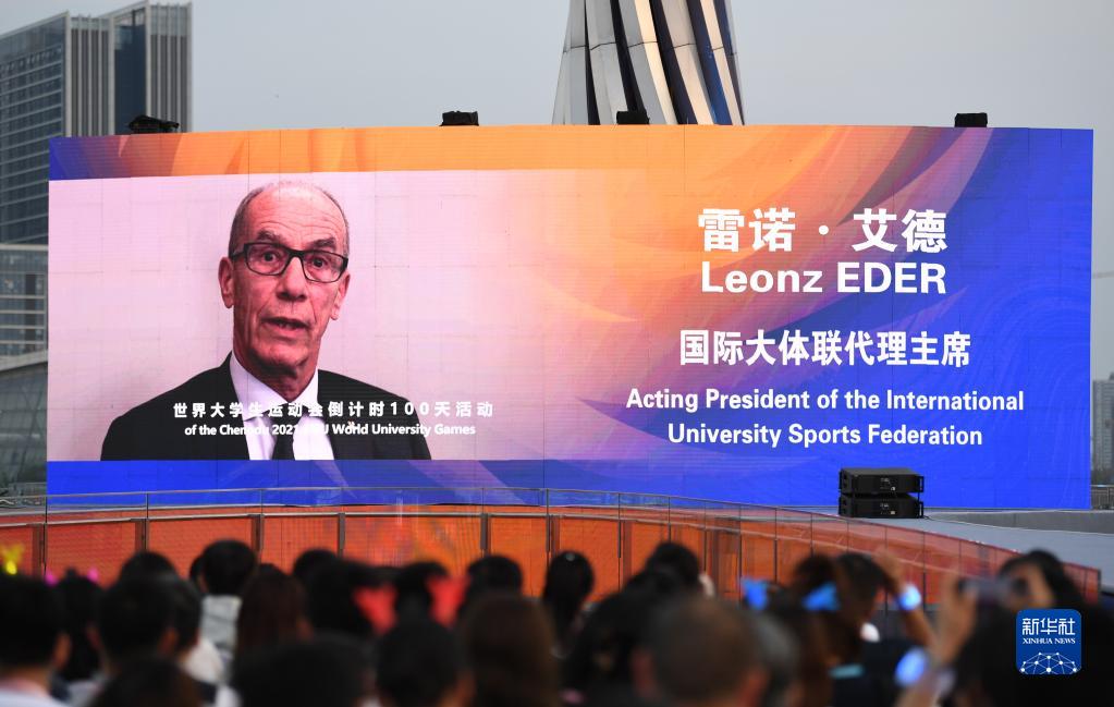 4月19日,在成都大運會倒計時100天啟動儀式上,國際大體聯代理主席雷諾·艾德視頻致辭。