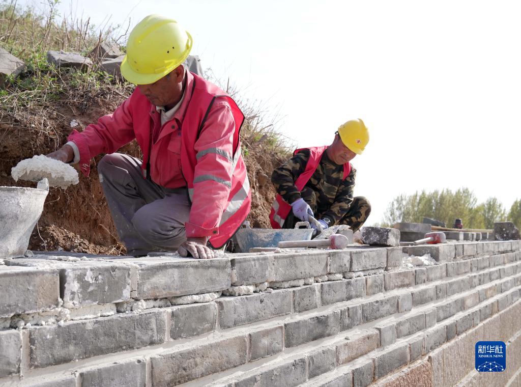 4月19日,工人在山海關長城北翼城修繕工程工地施工。