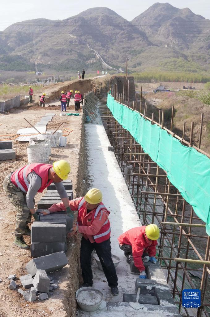 4月19日,工人在山海關長城北翼城修繕工程工地施工。