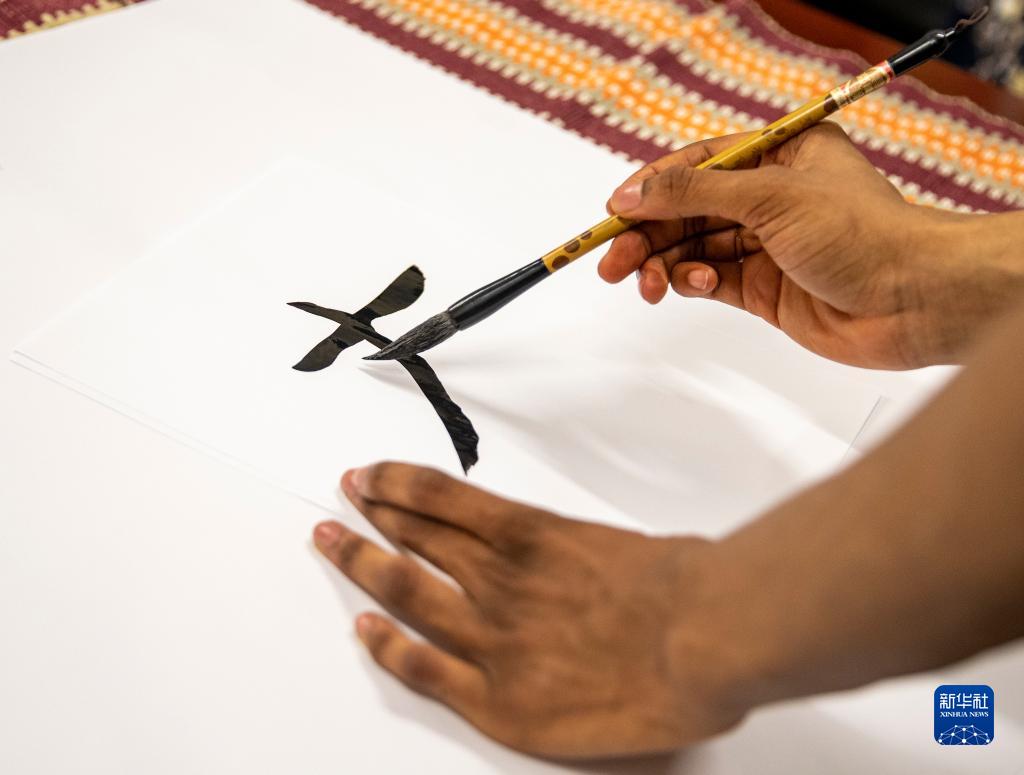 4月19日,學生在南非約翰內斯堡大學孔子學院體驗寫毛筆字。