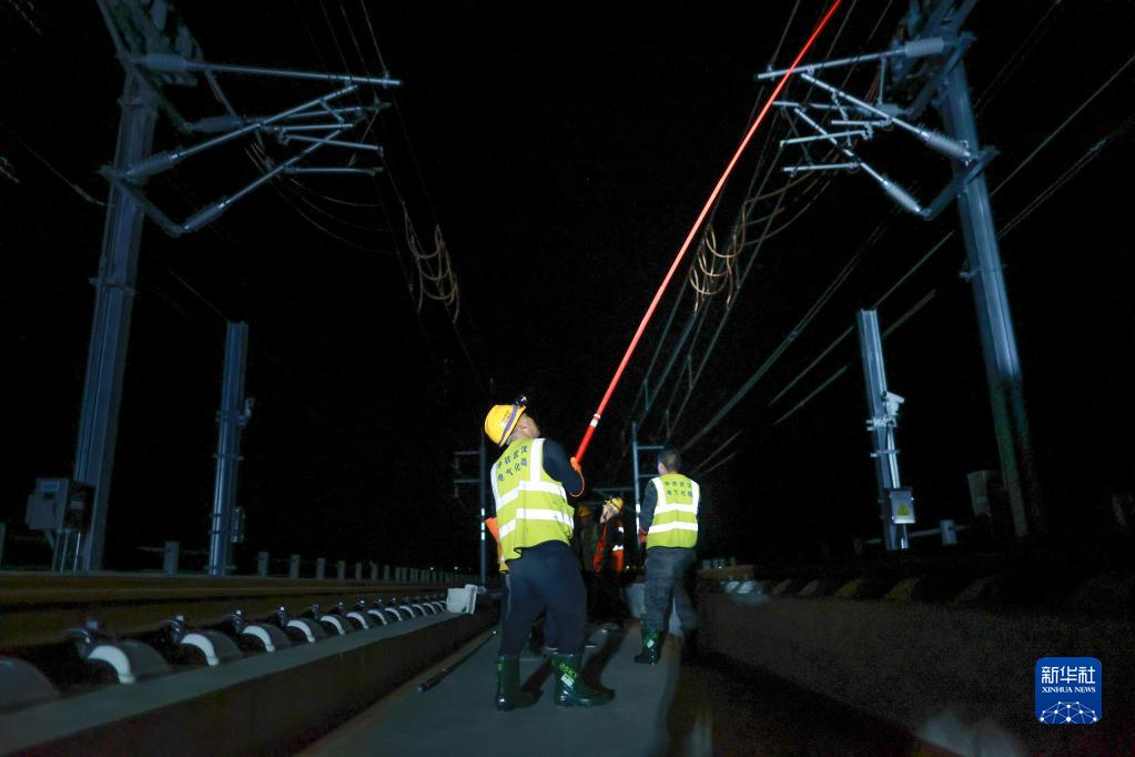 4月20日,中鐵武漢電氣化局工作人員在都勻東站附近的軌道上進行驗電操作。