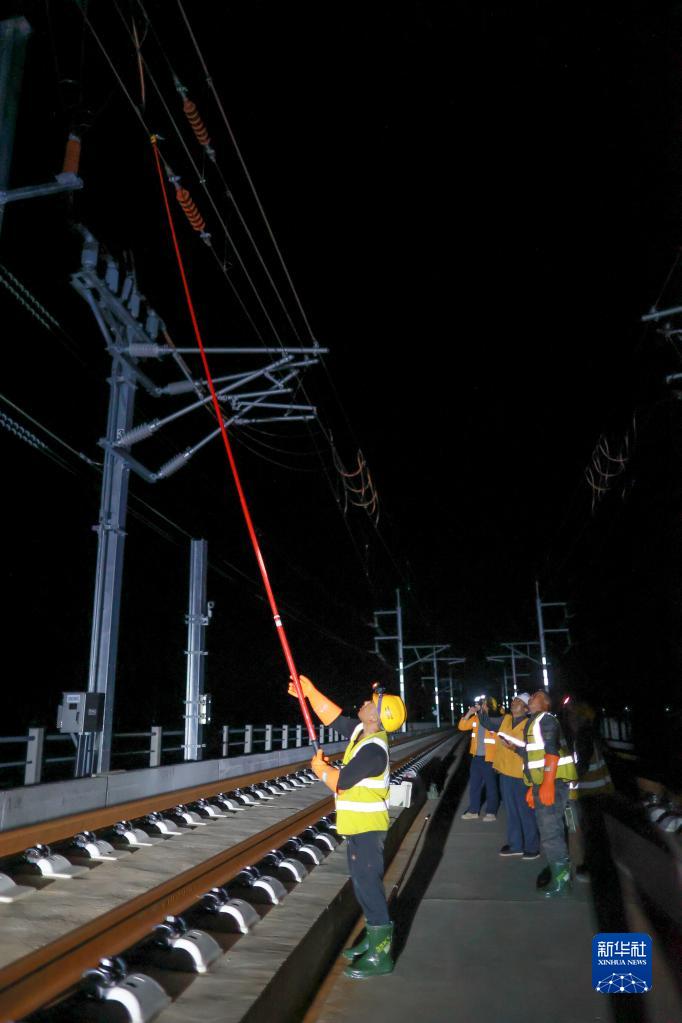 4月20日,中鐵武漢電氣化局工作人員在都勻東站附近的軌道上進行驗電操作。