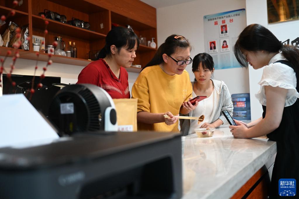 4月19日,屏南縣電商創業者楊晨芬(左二)在直播前與員工交流拍攝技巧。