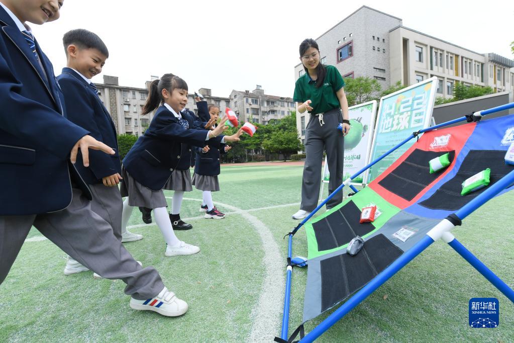 4月20日,湖州新風實驗小學下塘校區的學生在城管辦工作人員帶領下做垃圾分類趣味游戲。