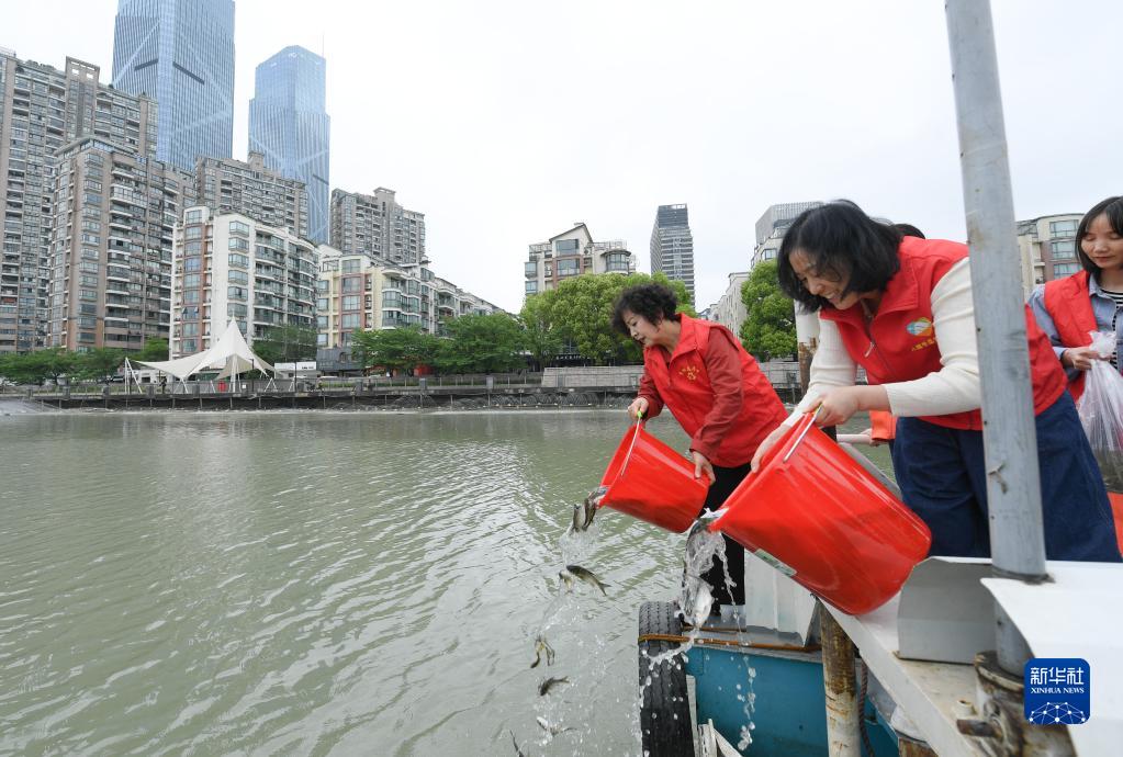4月20日,湖州市愛山街道的志愿者在河道投放魚苗。