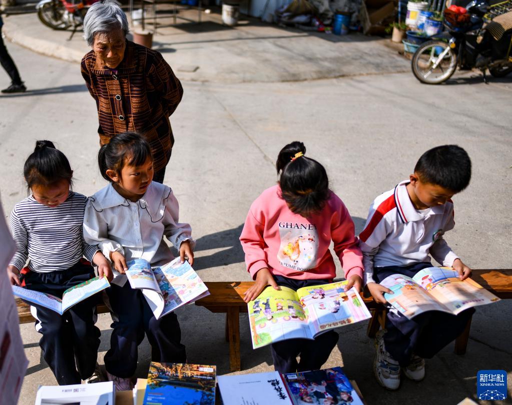 4月19日,小朋友在紅星村的愛心流動書攤閱讀。新華社記者 江文耀 攝