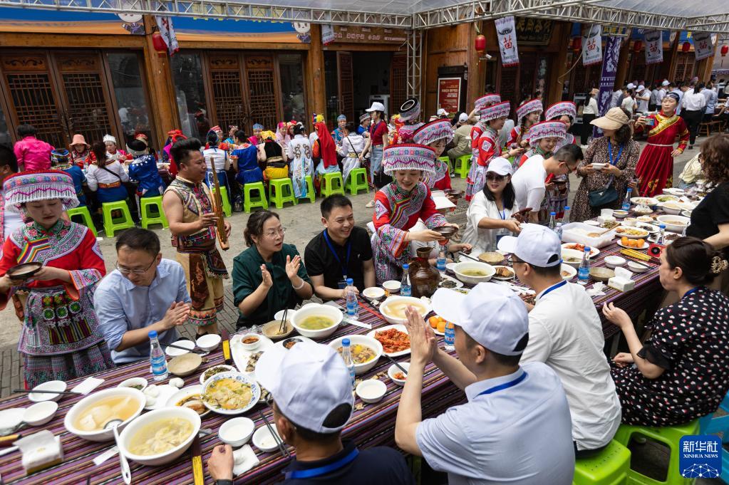 4月20日,嘉賓和游客體驗苗家長桌美食宴。