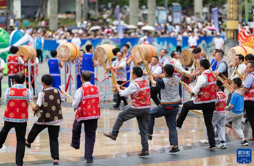 當日,四川省級非遺“興文苗族花山節”展示傳承活動在四川省興文縣市民廣場舉行?;顒由先谌雮鹘y祭祀、農耕文化、民族團結等內容的展演和苗家長桌美食宴,讓賓客感受到熱烈的節日氛圍。