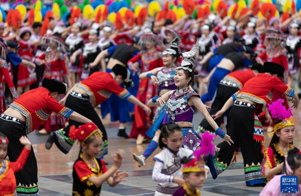 當日,四川省級非遺“興文苗族花山節”展示傳承活動在四川省興文縣市民廣場舉行?;顒由先谌雮鹘y祭祀、農耕文化、民族團結等內容的展演和苗家長桌美食宴,讓賓客感受到熱烈的節日氛圍。