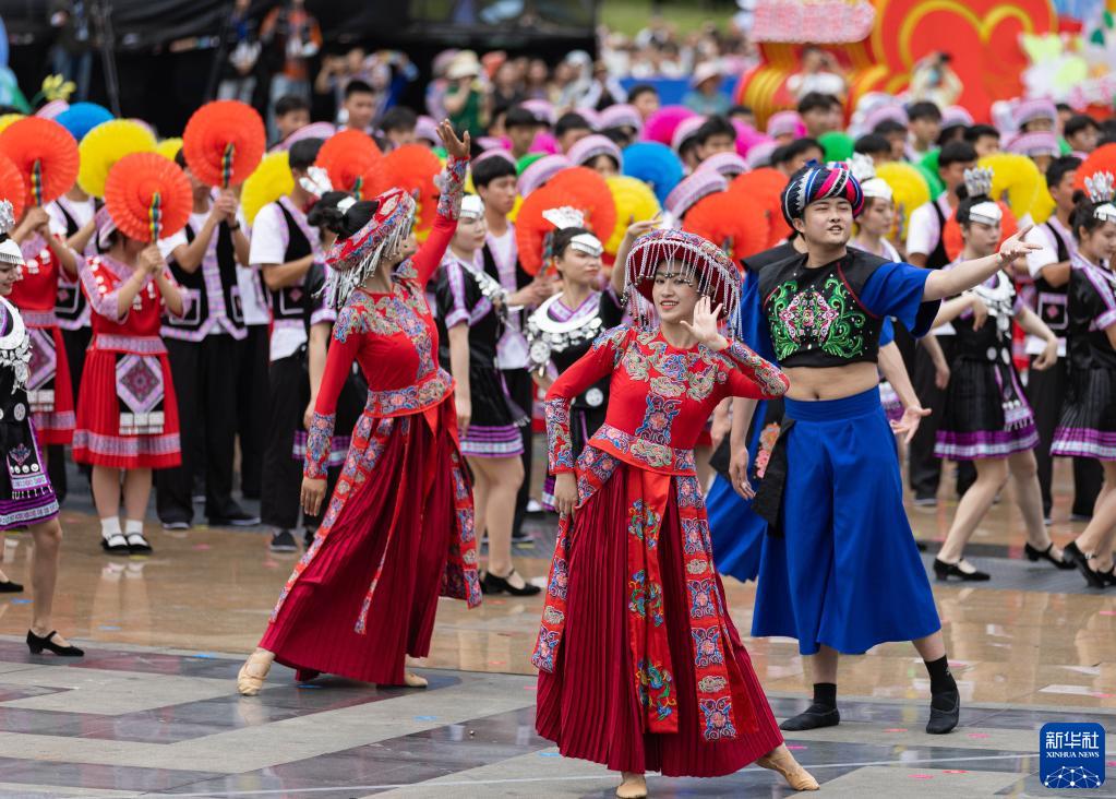 當日,四川省級非遺“興文苗族花山節”展示傳承活動在四川省興文縣市民廣場舉行?;顒由先谌雮鹘y祭祀、農耕文化、民族團結等內容的展演和苗家長桌美食宴,讓賓客感受到熱烈的節日氛圍。